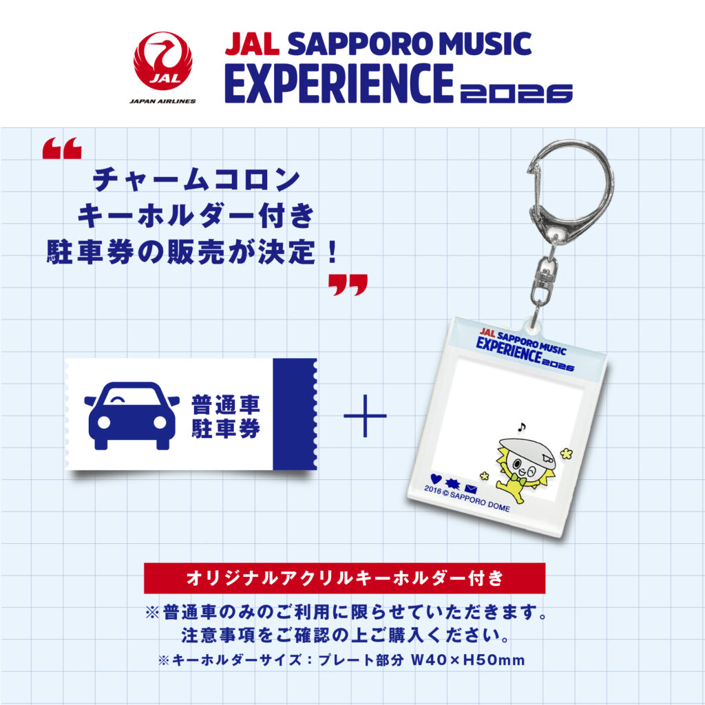 『JAL SAPPORO MUSIC EXPERIENCE 2026』における大和ハウス プレミストドームの前売駐車券の販売が決定しました。チャームコロンキーホルダー付きです。